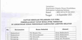 lampung selatan, www.irvatv.com Pemerintah Kabupaten (Pemkab) Lampung Selatan akan melakukan uji coba pembelajaran tatap muka (PTM) terbatas pada satuan pendidikan PAUD, SD, dan SMP...