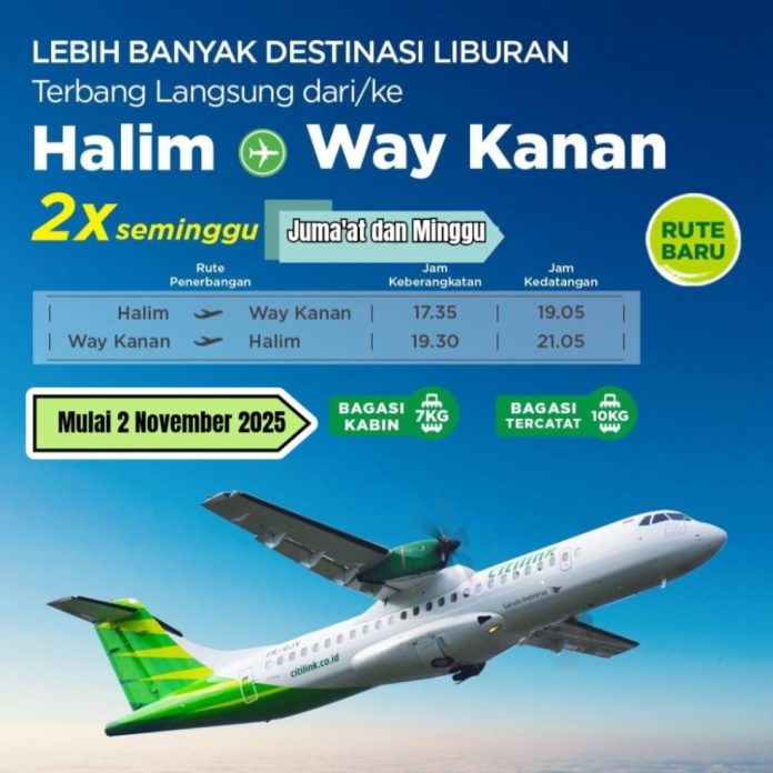 Kabar menggembirakan datang bagi masyarakat Kabupaten Way Kanan dan sekitarnya. Maskapai Citilink resmi membuka kembali rute penerbangan langsung Halim (Jakarta) – Way Kanan (Lampung) yang mulai beroperasi pada 2 November 2025.
