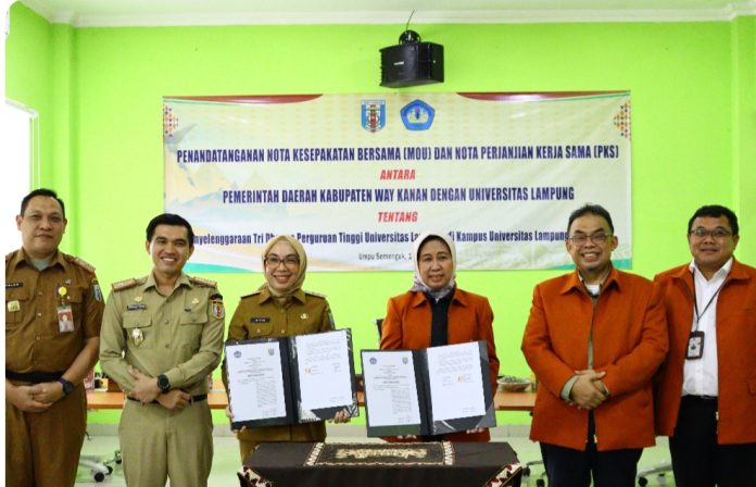 Bupati Ayu Asalasiyah, S.Ked., melakukan Penandatanganan Nota Kesepahaman dan Perjanjian Kerja Sama antara Universitas Lampung dengan Pemerintah Kabupaten Way Kanan di Kampus PSDKU Unila Way Kanan, Kecamatan Umpu Semenguk.