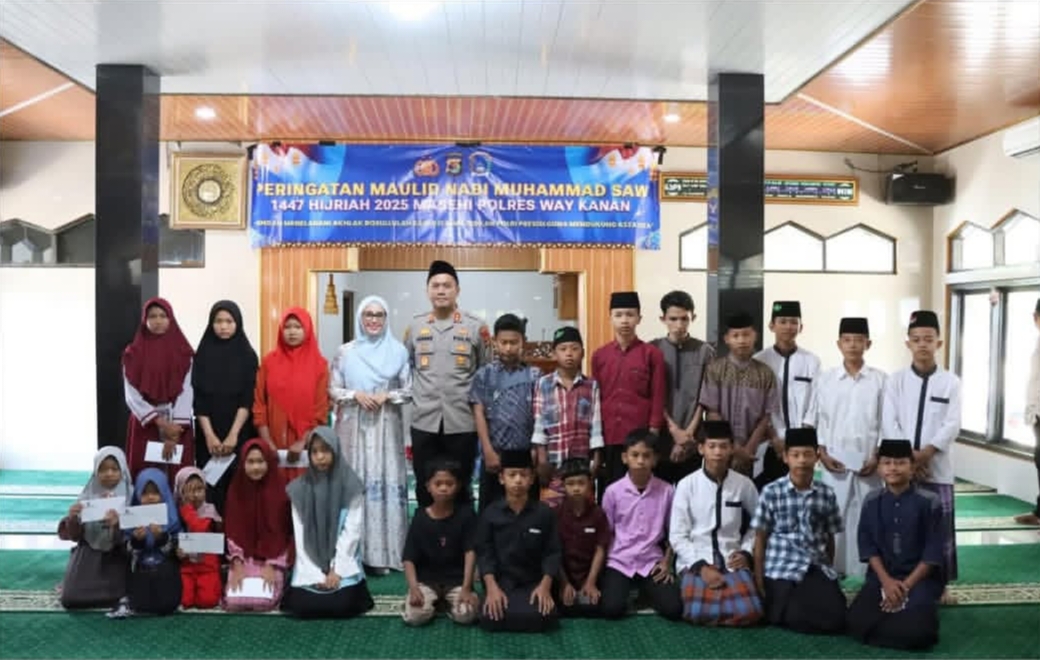 Polres Way Kanan menggelar doa bersama dan santunan anak yatim piatu, dalam rangka memperingati Maulid Nabi Muhammad SAW 1447 Hijriah bertempat di Masjid Darul Fattah. Jum’at (05/09/2025).